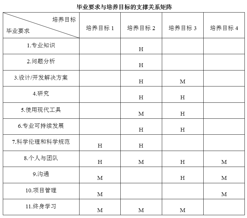 注:.毕业要求与培养目标的支撑关系分别用“H”(高)、“M”(中)、“L”(弱)表示。H至少覆盖80%,M至少覆盖50%,L至少覆盖30%。