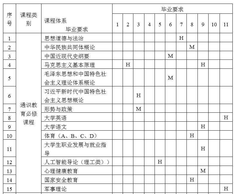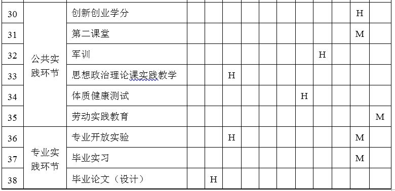注:必修课程/实践环节与毕业要求达成的相关度分别用“H”(高度相关)、“M”(中等相关)、“L”(弱相关)标示,相关度的涵义是指该课程覆盖毕业要求指标点的比例,H至少覆盖80%,M至少覆盖50%,L至少覆盖30%。