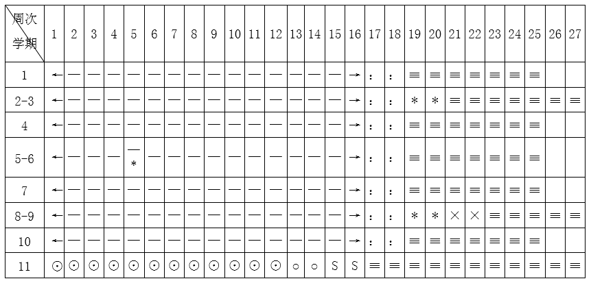 所用标示“符号”的含义:“←——→”为理论教学;“≡”为假期;“△”为课程设计或综合(创新)实验;“⊙”毕业论文(设计)及答辩;“:”考试;“*”为社会实践或公益劳动;“×”为教学实习(或生产、认识实习)和毕业实习;“∧”为测量实习;“S”为机动;“○”为入学教育或毕业鉴定;“◆”为军训;“∥”为机械制造基础实习。