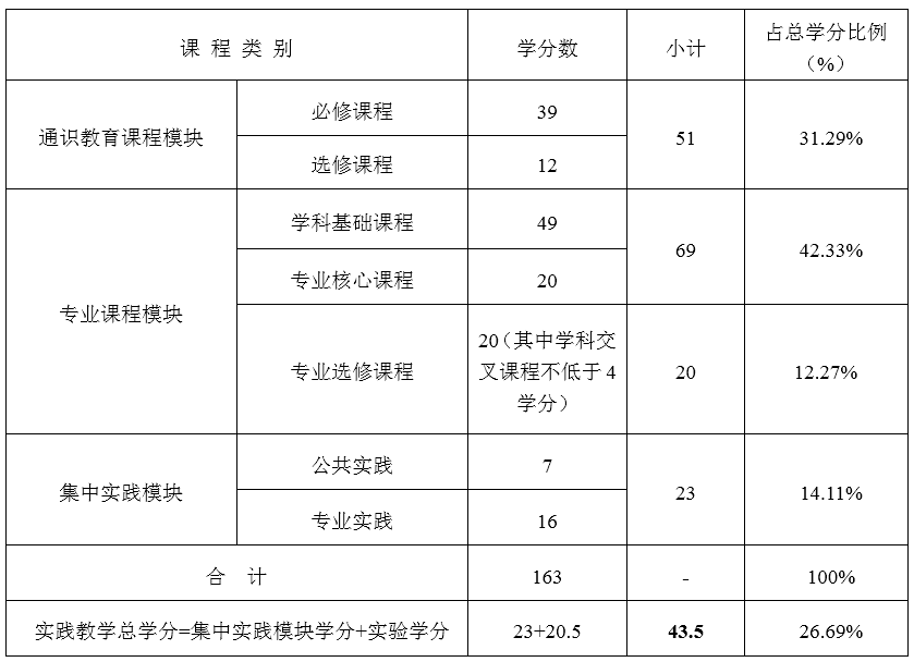 毕业条件:在学校规定学习年限内,完成专业培养方案规定的课程及环节并获得163学分(通识教育选修课程中美育课程2学分,劳动理论教育课程1学分,四史课程1学分),军事训练考核合格,劳动实践教育课程成绩合格,通过《国家学生体质健康标准》测试,准予毕业并获得毕业证书。