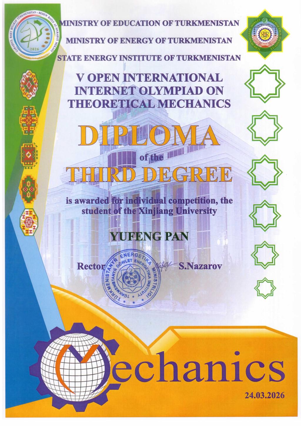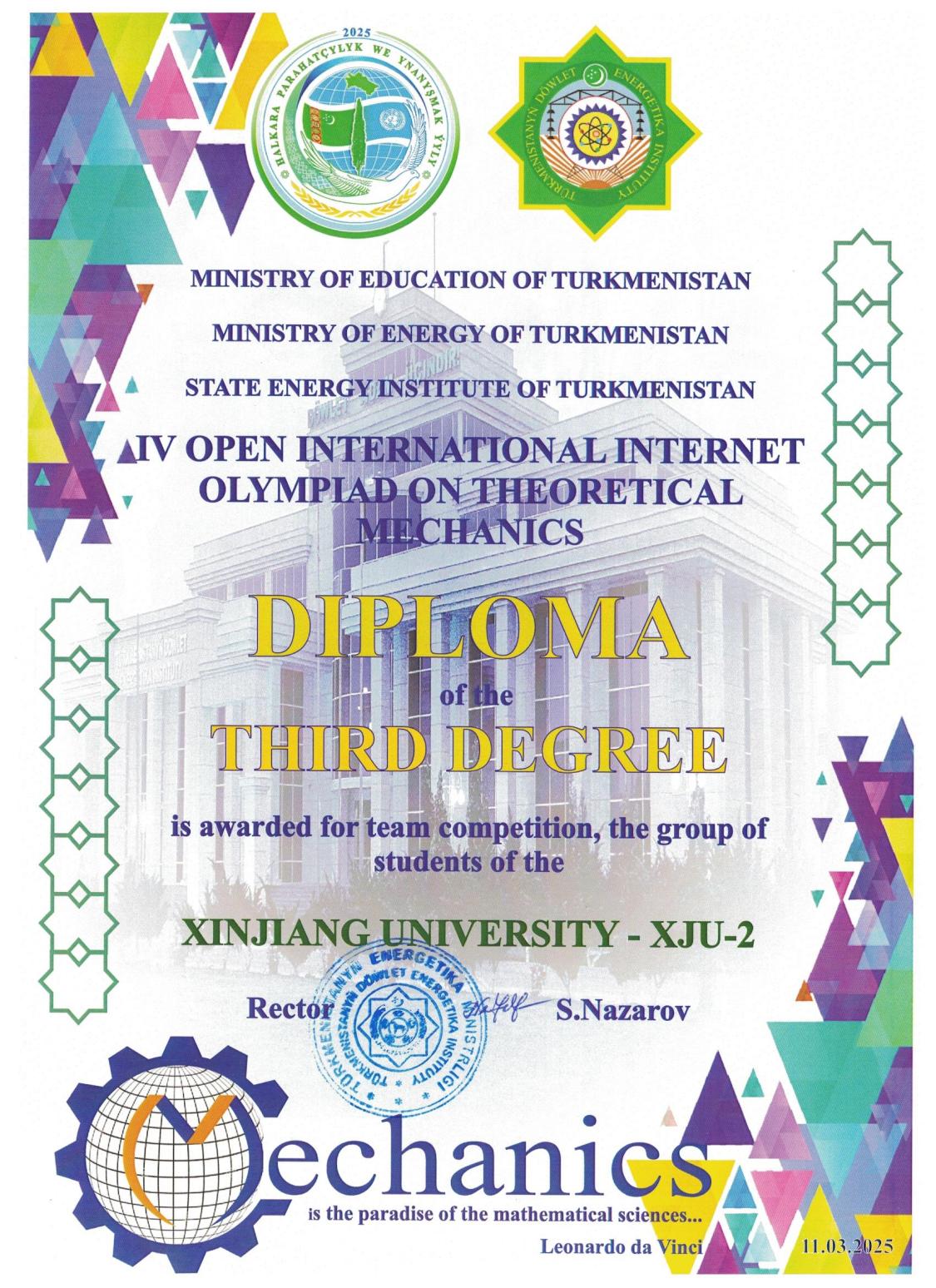 2025年3月,在新疆大学物理科学与技术学院和国际交流与合作处的大力支持和帮助下,新疆大学物理科学与技术学院选出了10名学生,代表新疆大学首次参加了第四届国际互联网奥林匹克学科竞赛“理论力学”的个人赛和团体赛,并取得了一项团体赛三等奖。