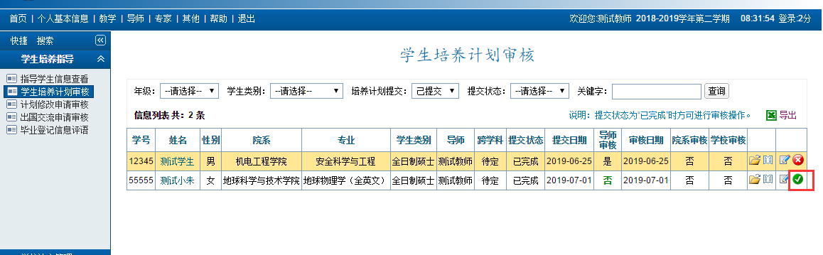 功能菜单:导师 → 学生培养指导 →学生培养计划审核