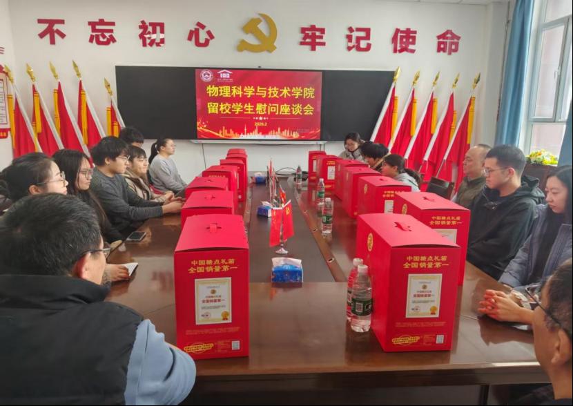 春节即将来临之际,为关心关爱寒假春节期间留校学生,确保留校学生度过一个温馨、祥和的寒假,物理科学与技术学院2月10日在物理A316会议室组织开展了寒假春节留校学生慰问活动,学院党委书记段海明、纪委书记杨银玲、副院长陈恒雷以及班主任和导师代表与留校学生欢聚一堂,共迎新春佳节。