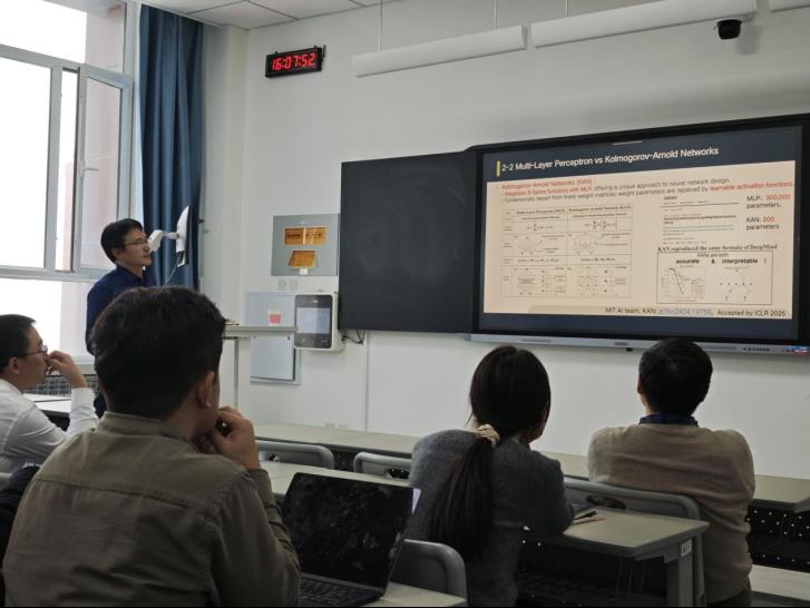 报告结束后,王教授与物理学院师生展开了热烈研讨。现场气氛活跃,师生们踊跃提问,围绕深度学习在科研应用中的耗时问题、设备配置需求以及量子深度学习的发展前景等话题进行了深入交流。王教授指出,深度学习技术正以前所未有的速度发展,逐渐成为天体物理学研究的重要工具。他表示,物理学研究者应当把握这一趋势,积极推动深度学习与科学研究的深度融合。同时,王教授也表达了与物理学院师生展开长期、密切合作的意愿与期待。