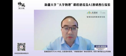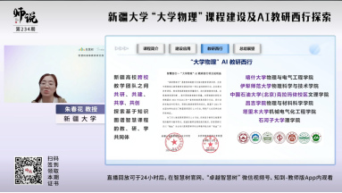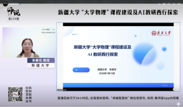 为深入推动物理基础课程教学改革,积极探索人工智能技术与教育教学深度融合的新模式,提升课程建设质量与辐射影响力,2026年1月13日晚,我院朱春花教授应智慧树高等教育研究院邀请,做客其品牌直播栏目《师说》第234期,作了题为《新疆大学“大学物理”课程建设及AI教研西行探索》的专题分享。本次直播通过“卓越智慧树”视频号和智慧树官网平台面向全国高校教师开放,吸引了来自新疆、云南等省(区)高校的2800余名教师在线观看。