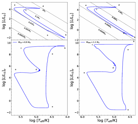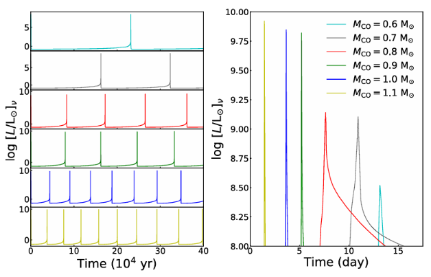 图1. 0.9M⊙与1.1M⊙白矮星的新星爆发中中微子发光光度演化