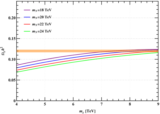 图6. 暗物质残留密度随其质量的变化关系,其中右手中微子质量mN取不同值。理论曲线(实线)显示,为满足普朗克卫生观测(橙色区域),暗物质质量需与mN协同变化,暗示了两者之间的紧密关联,并标定了模型的可行参数空间。