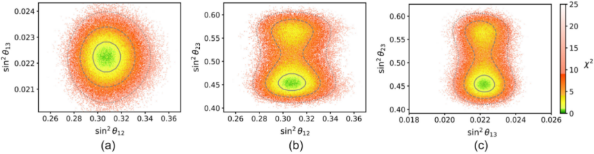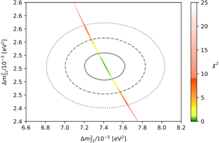 图1. 理论预言与实验数据在中微子质量平方差上的对比。散点分布与实验置信区间(实线、虚线和点划线分别表示1σ, 2σ, 3σ置信区间)高度重合,表明该模型能成功再现观测到的中微子振荡参数。
