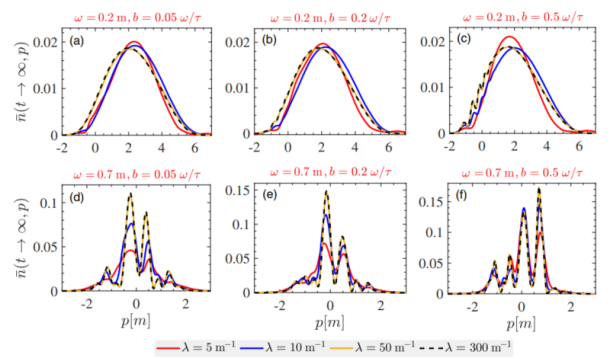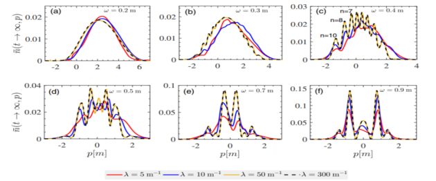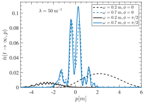 图1. 在不同频率的空间非对称电场中产生粒子的动量分布