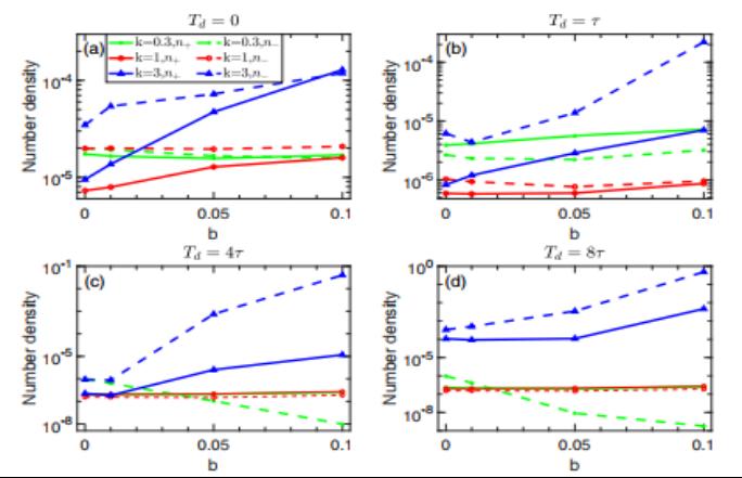 图3显示自旋向上粒子数密度n+和自旋向下粒子数密度n-随外场参数的演化。 研究发现,通过精确地调节两个旋转电场的形状、频率啁啾和时间延迟,可以产生自旋极化对。对于缩短的非对称包络电场,当时间延迟较大、啁啾参数也较大时,自旋非对称度达到了98.62%,自旋向上粒子主导对产生过程。而在扩展的非对称包络电场下,对于较大的时间延迟和啁啾参数,自旋非对称度达到了−99.94%,自旋向下粒子主导对产生过程。